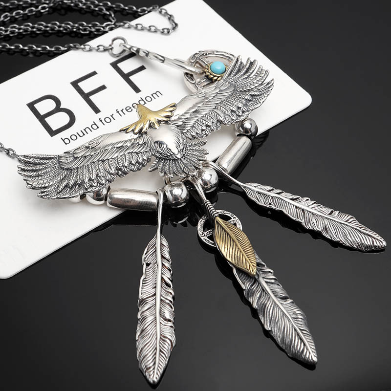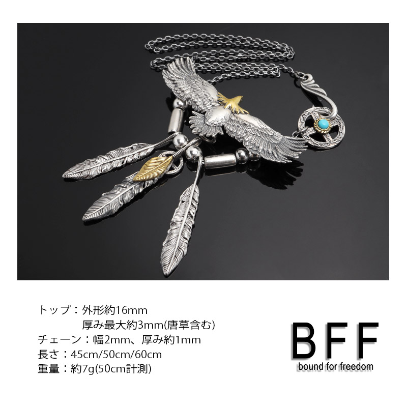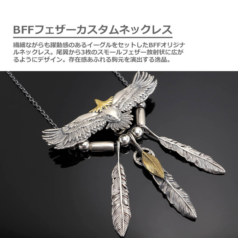 繊細ながらも躍動感のあるイーグルをセットしたBFFオリジナルネックレス。尾翼から3枚のスモールフェザー放射状に広がるようにデザイン。存在感あふれる胸元を演出する逸品。