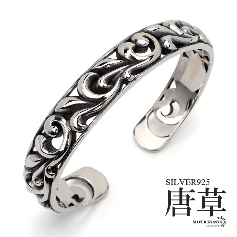 立体感があり、シルバー925の質感をしっかり楽しめるバングル。力強い唐草模様が映えるデザイン。透け感がありシンプルにも楽しめます。