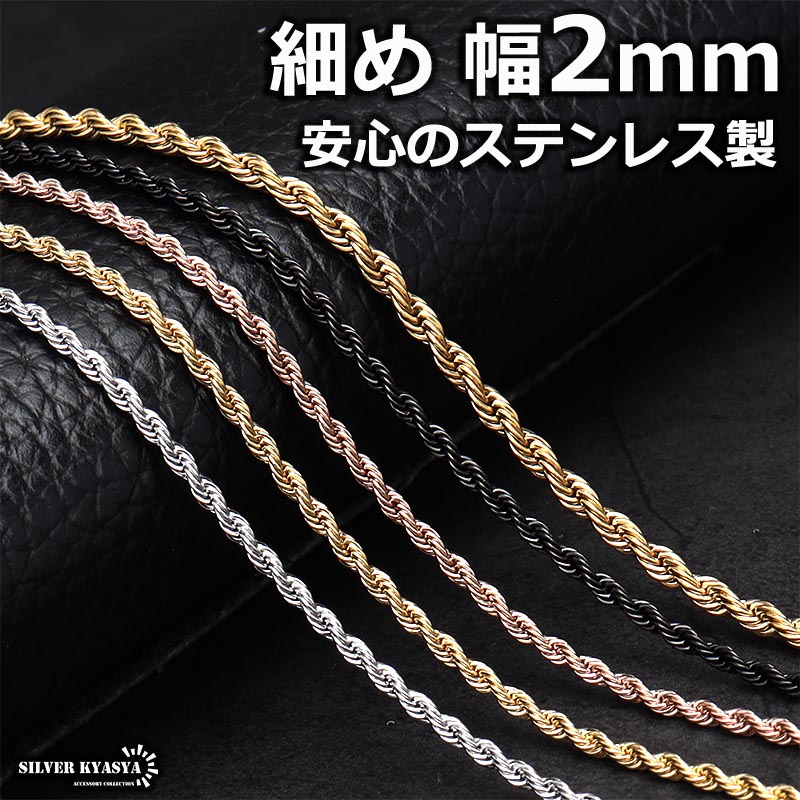 ステンレス ロープチェーンネックレス 細身 幅2mm ゴールド 金 シルバー ブラック ローズゴールド ネックレスチェーン 金属アレルギー対応