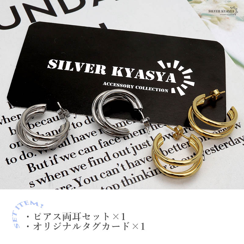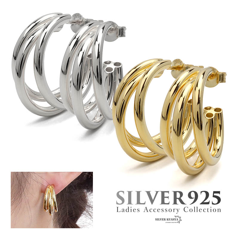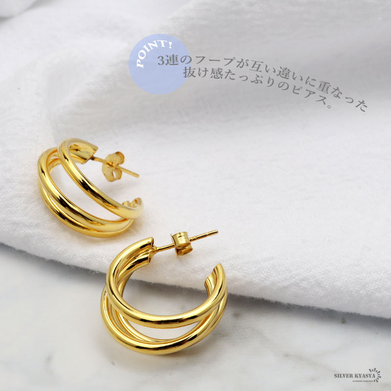 ピアス 金属アレルギー対応 シルバー925 S925 18KGP フープピアス 3連 C型 ゴールド シルバー 金 銀 フェミニン シンプル 両耳用 2点セット