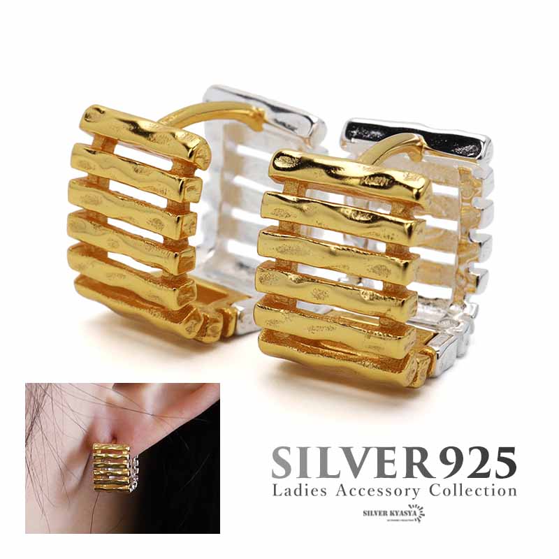 シルバー925 横ラインピアス 太め フープピアス スクエアピアス ワイドピアス バイカラーピアス 両耳 金属アレルギーフリー