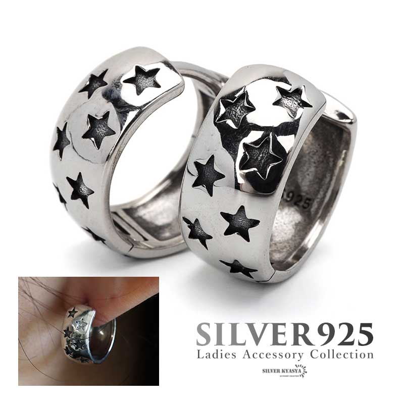 シルバー925 太めフープピアス 銀 甲丸ピアス 両耳 レディース ワイドピアス スター 星 おしゃれ 女子 金属アレルギーフリー