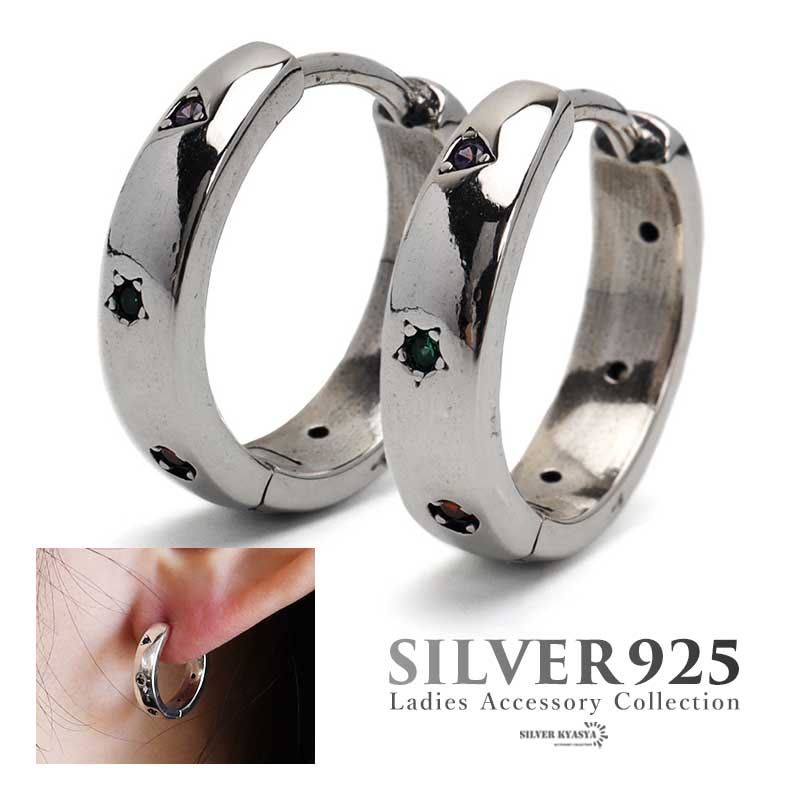 シルバー925 幾何模様に潜めたストーンが可愛い フープピアス 両耳 ピアス 甲丸ピアス 両耳 大人 女子 金属アレルギーフリー