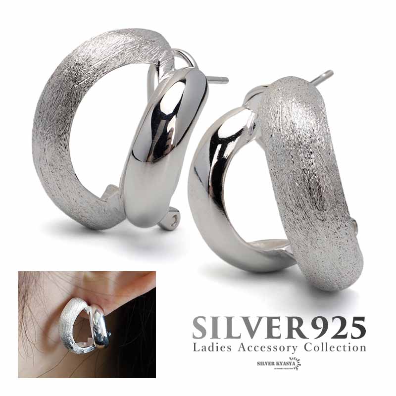 シルバー925 幾何学デザイン ワイドピアス フープピアス 太めピアス 大きめ 重工ピアス つや消し 両耳 金属アレルギーフリー