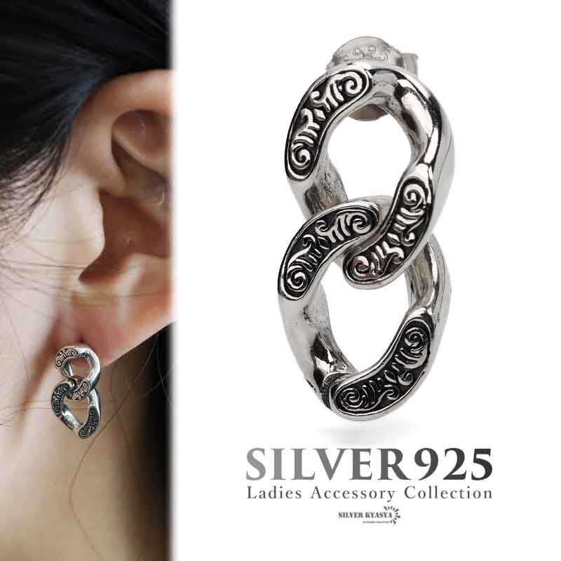 チェーンピアス 唐草模様 ドロップピアス シルバー925 スタッドピアス 片耳用 1点セット シルバー 金属アレルギーフリー