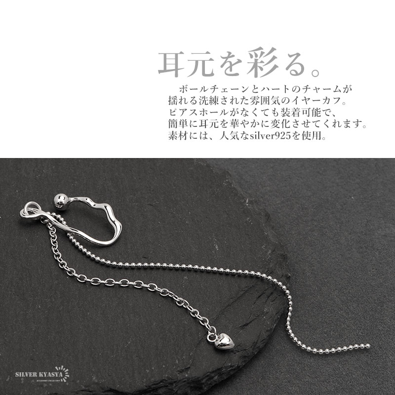ボールチェーンとハートのチャームが揺れる洗練された雰囲気のイヤーカフ。