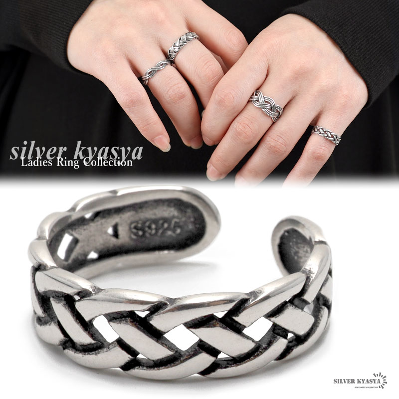 編み込みデザインのシンプルなリング。単体でも存在感があり、重ね付けしても可愛い、使いやすさ抜群のアイテム。素材には、人気のSILVER925を使用。サビや劣化がほとんどなく、金属アレルギーも出にくい。ギフト用にも、保管用にも便利!当店オリジナル巾着ポーチと一緒にお届け。