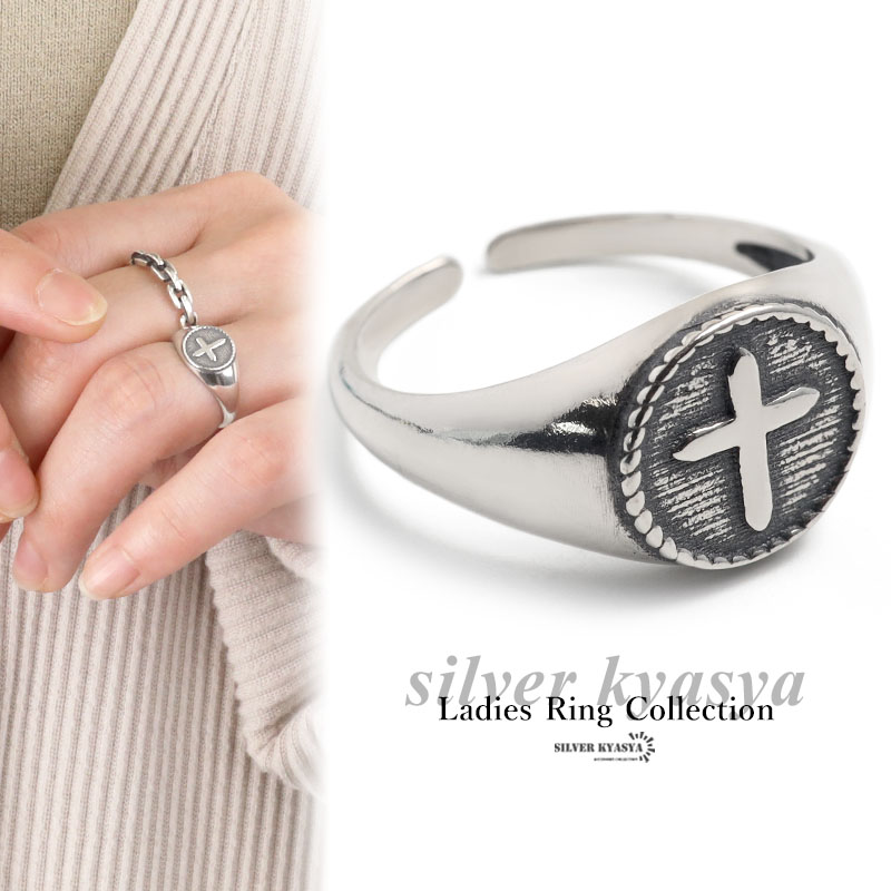 リング レディース シルバー925 フリーサイズ クロス 十字架 印台リング シルバー 銀色 指輪 金属アレルギー