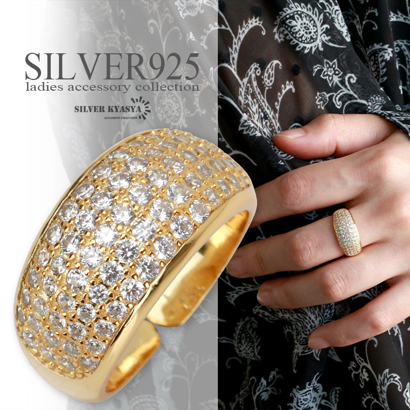 シルバー925 パヴェ CZ 指輪 18K ゴールド 指輪 銀 アレルギー対応 フリーサイズ