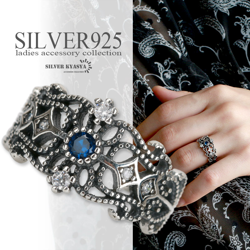 燻加工が雰囲気たっぷりのお洒落なゴシックリングです!ブルーのジルコニアがワンポイントに輝き、指元に注目を引く仕上がりです!レース模様がアンティークな印象もあり、ティアラのような豪華さを表現!ユニークな出来栄えのアイテムです!クオリティの高いジルコニアを使用しており、小ぶりながらもキラキラと輝きます!
