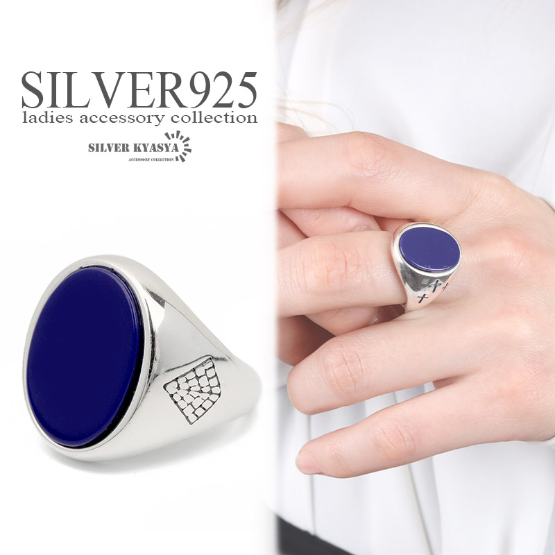 深みのあるブルーの石があしらわれた印台リングです。一見シンプルです。が、両サイドにはクロスとピラミッドの彫刻が施されている遊び心のあるデザインになっています。ブラックとホワイト、ラズライト(青金石)の3色タイプ展開です。