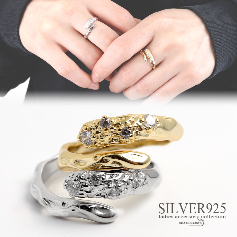 シルバー925リング S925 18K GP ストーン 2連風 槌目 シルバー ゴールド 指輪 金属アレルギー対応 フォークリング