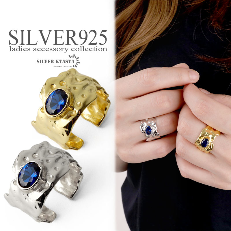 シルバー925 ストーンリング 槌目 凹凸 指輪 SILVER925 ゴールド シルバー 18K GP リング フリーサイズ オープンリング 金属アレルギー対応