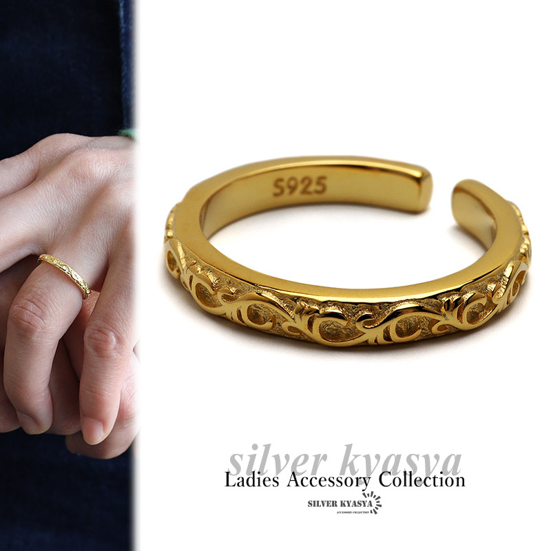 ゴールド唐草リング 細身 アラベスクリング 指輪 18KGP かわいい シンプル お洒落 シルバー925