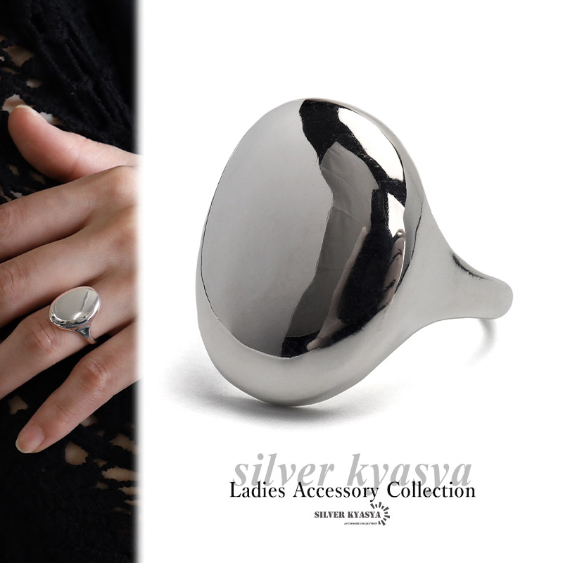 自然な歪みが可愛らしいオーバルリング。ツヤっとしたメタリックな質感が肌に良く映えます。