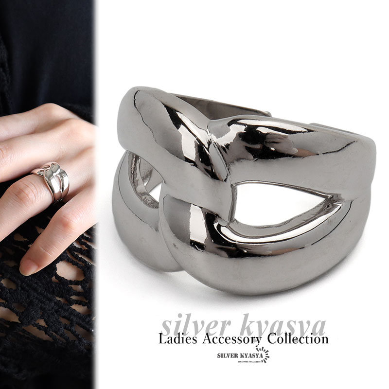 2本のラインがクロスするノットリング。太幅なラインと鏡面のようなメタリックな質感が存在感を放つアイテム。