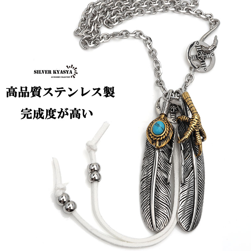 ステンレス ダブルフェザーネックレス メンズ ペンダント シルバー 太陽 ターコイズ フェザーネックレス 特大 フェザー