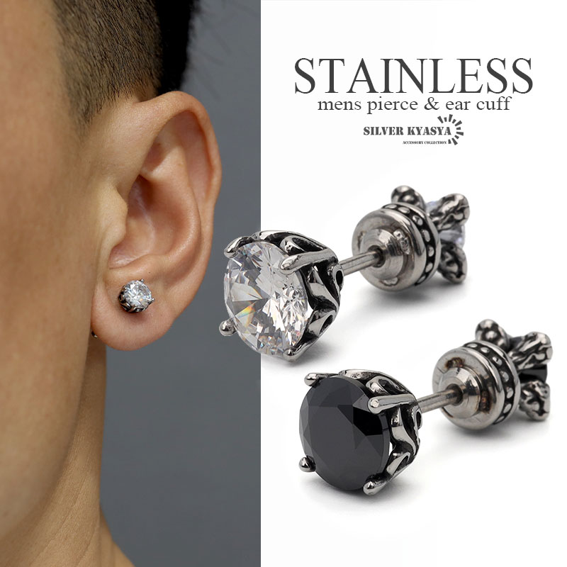 ストーンピアス オニキスピアス ステンレス オニキス CZ メンズ スタッドピアス ホワイト ブラック 一粒ピアス 唐草ピアス 金属アレルギー対応 片耳 1点