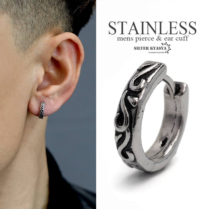 アラベスク フープピアス ステンレス メンズ シンプル ピアス シルバー 唐草 燻し風加工 金属アレルギー対応 片耳 1点