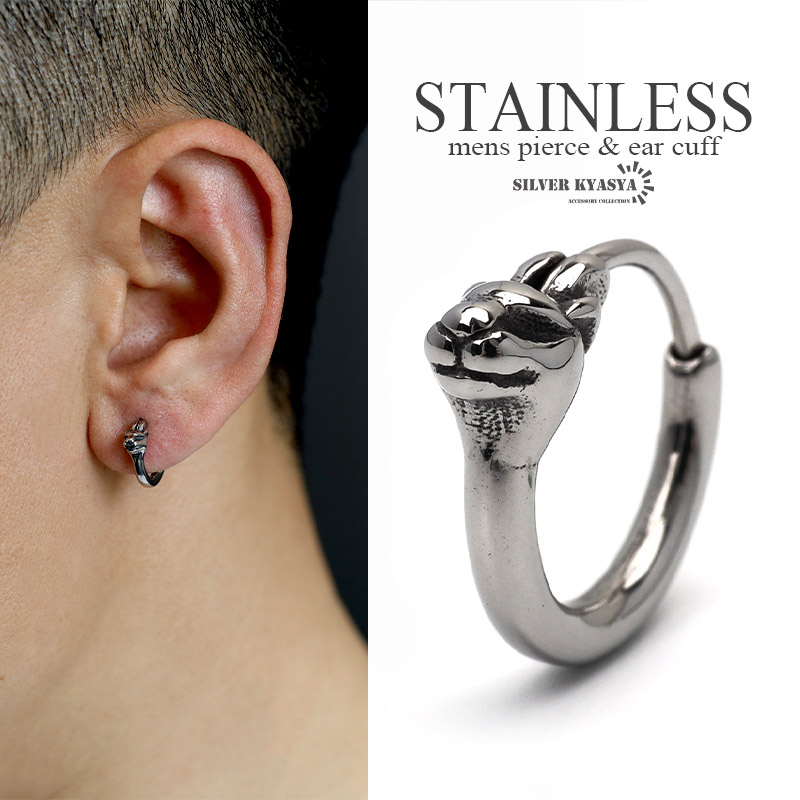 うさぎ フープピアス ステンレス メンズ モチーフピアス シルバー アニマル 燻し風加工 金属アレルギー対応 片耳 1点
