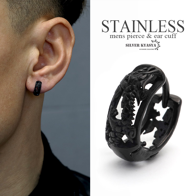 ブラック フープピアス ステンレス ドラゴン 龍 メンズ 透かし 唐草 金属アレルギー対応 片耳 1点
