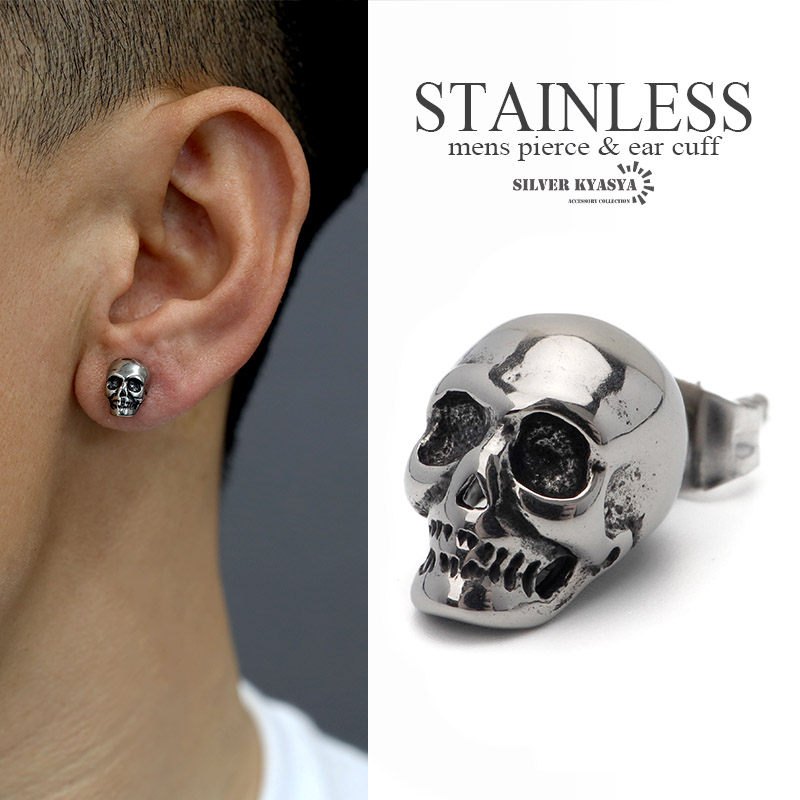 スカルピアス ステンレス メンズ スタッドピアス シルバー 骸骨 ドクロ 燻し風加工 金属アレルギー対応 片耳 1点