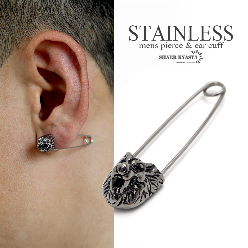 安全ピンピアス ステンレス メンズ モチーフピアス シルバー ウルフ 狼 ユニーク 金属アレルギー対応 片耳 1点