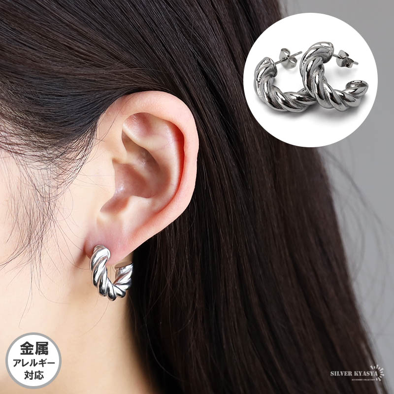 安心のステンレス素材 ワイドピアス シルバー ツイストピアス 大ぶり 太め ロープピアス ねじり 両耳 2点セット