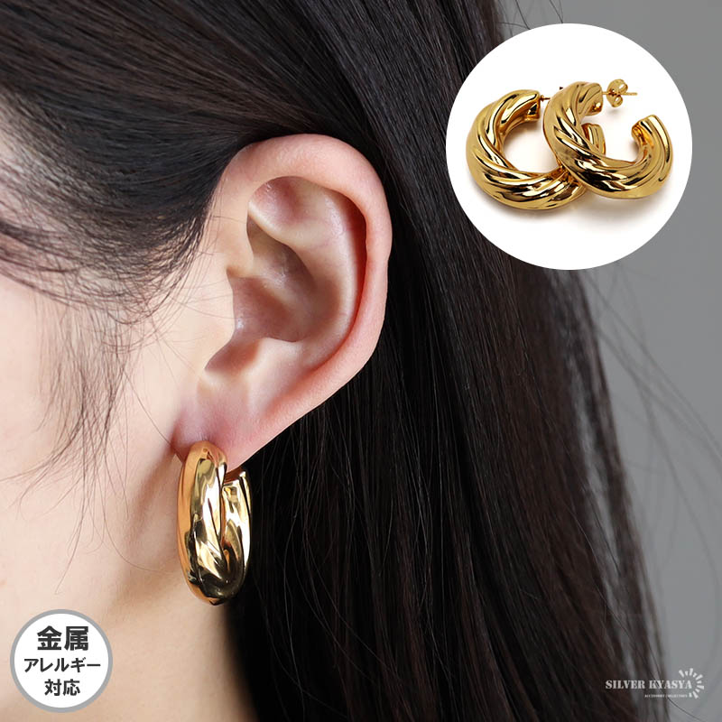 安心のステンレス素材 18KGP ワイドピアス ゴールド 金色 ツイストピアス 大ぶり 太め フープピアス 両耳 2点セット