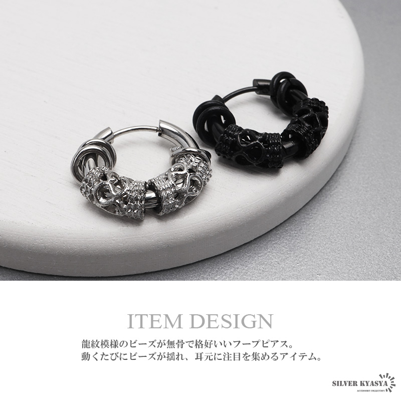 龍紋模様のビーズが無骨で格好いいフープピアス。動くたびにビーズが揺れ、耳元に注目を集めるアイテム。