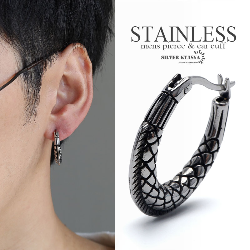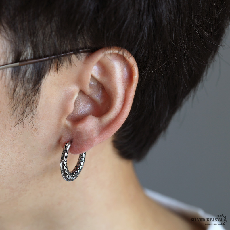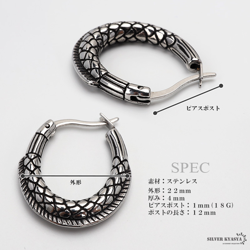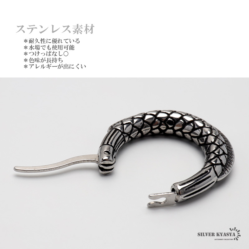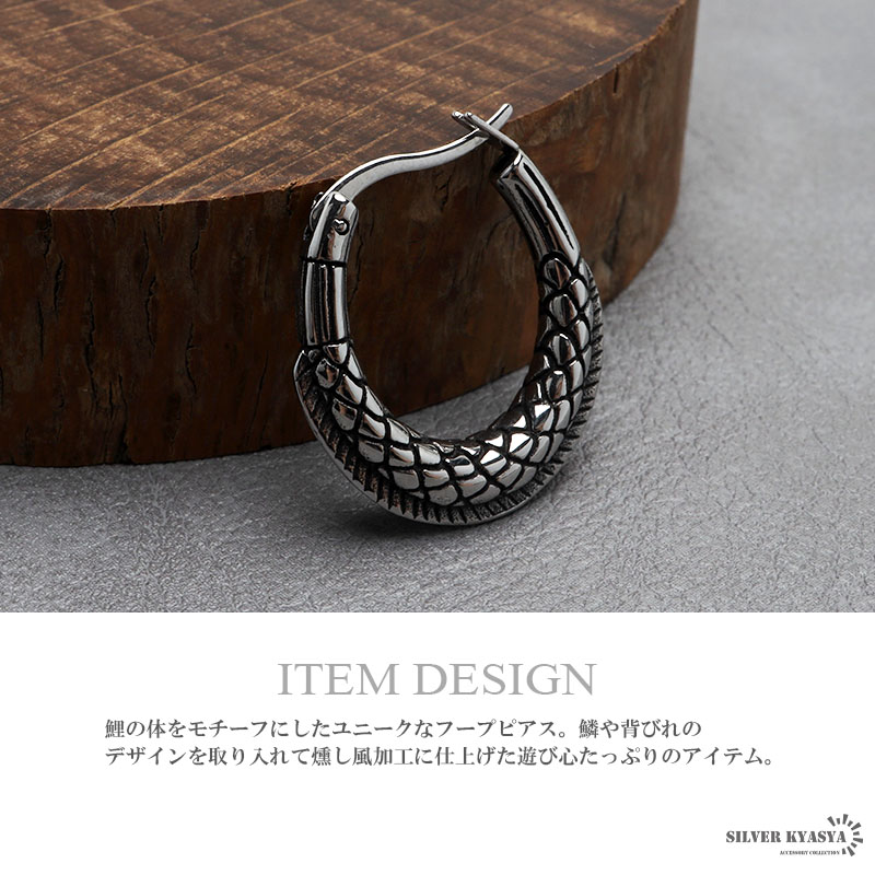 ステンレス素材 フープピアス シルバー 鯉ピアス 個性的 フィッシュピアス 鯉 魚 鱗模様 ユニーク 金属アレルギーフリー 片耳