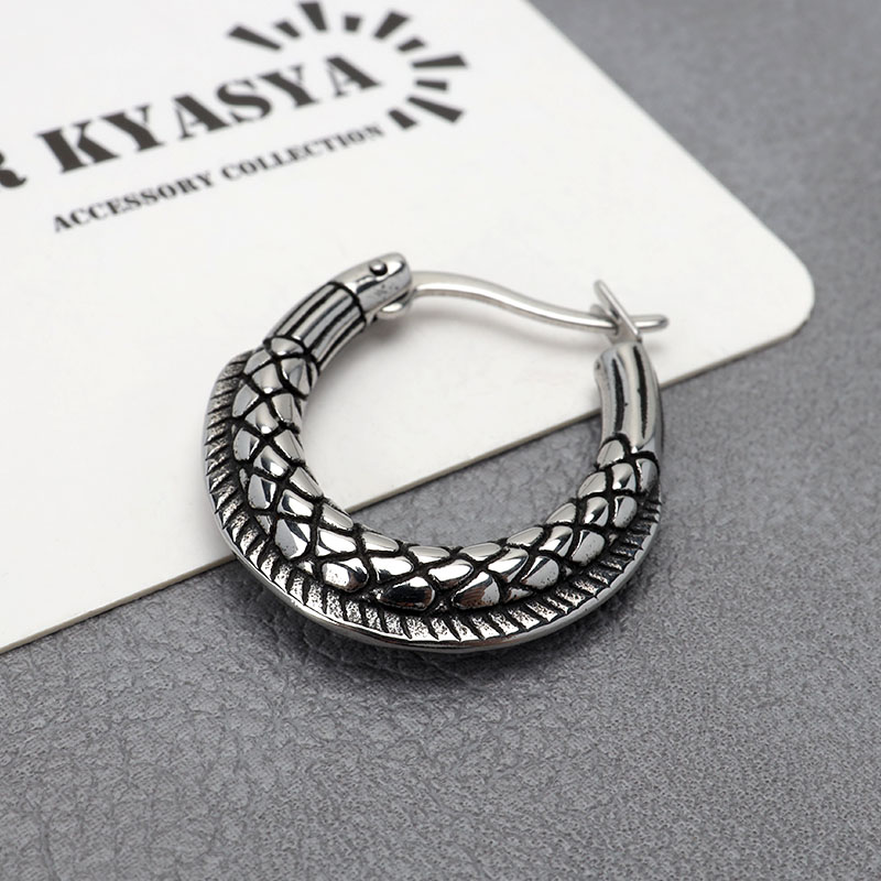 鯉の体をモチーフにしたユニークなフープピアス。鱗や背びれのデザインを取り入れ、燻し風加工に仕上げた遊び心たっぷりのアイテム。