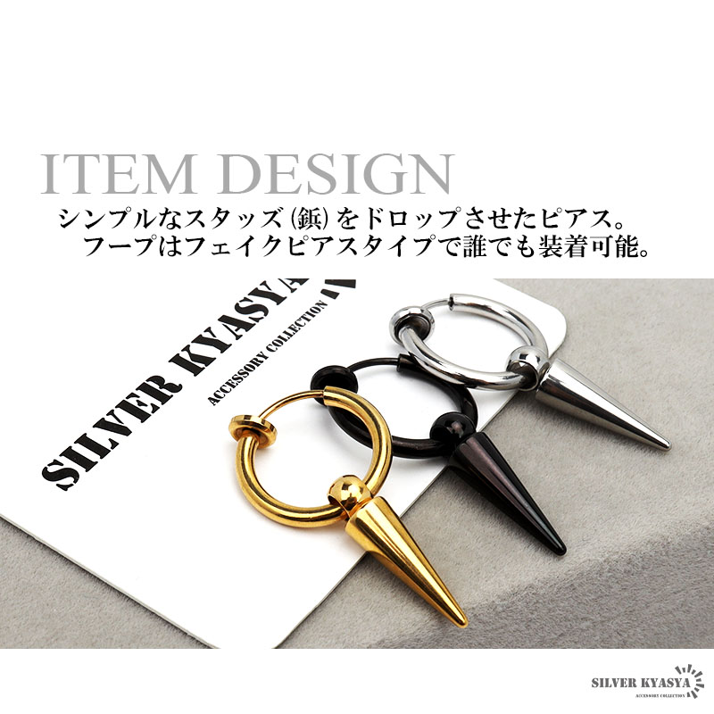 シンプルなスタッズ(鋲)をドロップさせたピアス。フープはフェイクピアスタイプでピアスホール(耳の穴)がなくても使用できます。ゴールド/シルバー/ブラックの3カラーアイテム。