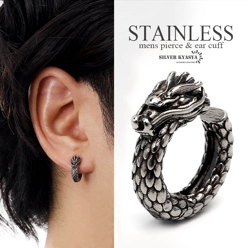 ステンレス ドラゴンイヤーカフ 龍 竜 ワンタッチ 開閉式 メンズ ピアス シルバー 耳の穴不要 金属アレルギー対応 片耳用 1点