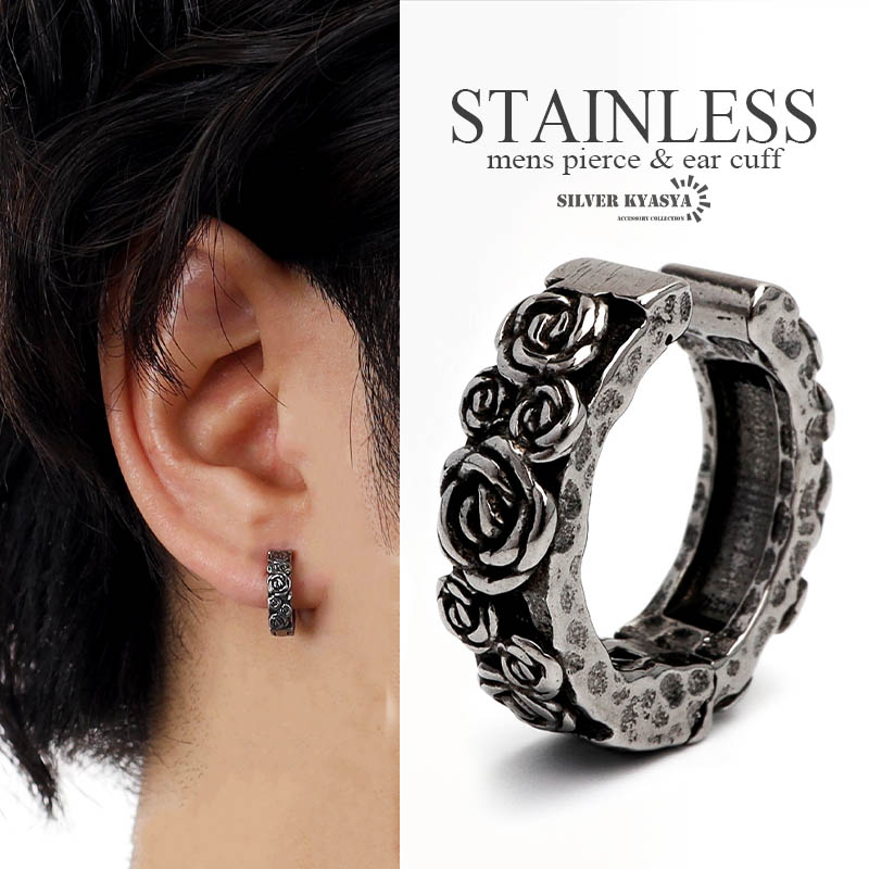 ステンレス バラ イヤーカフ 薔薇 花 ワンタッチ 開閉式 メンズ ピアス シルバー 耳の穴不要 金属アレルギー対応 片耳用 1点