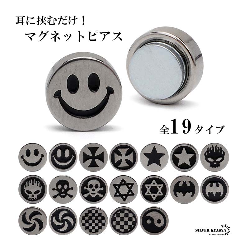 マグネットピアス 磁石 2点セット メンズ レディース イヤリング イヤーカフ 両耳用 スマイル クロス 六芒星 お洒落 ピアス ステンレス つけっぱなしOK