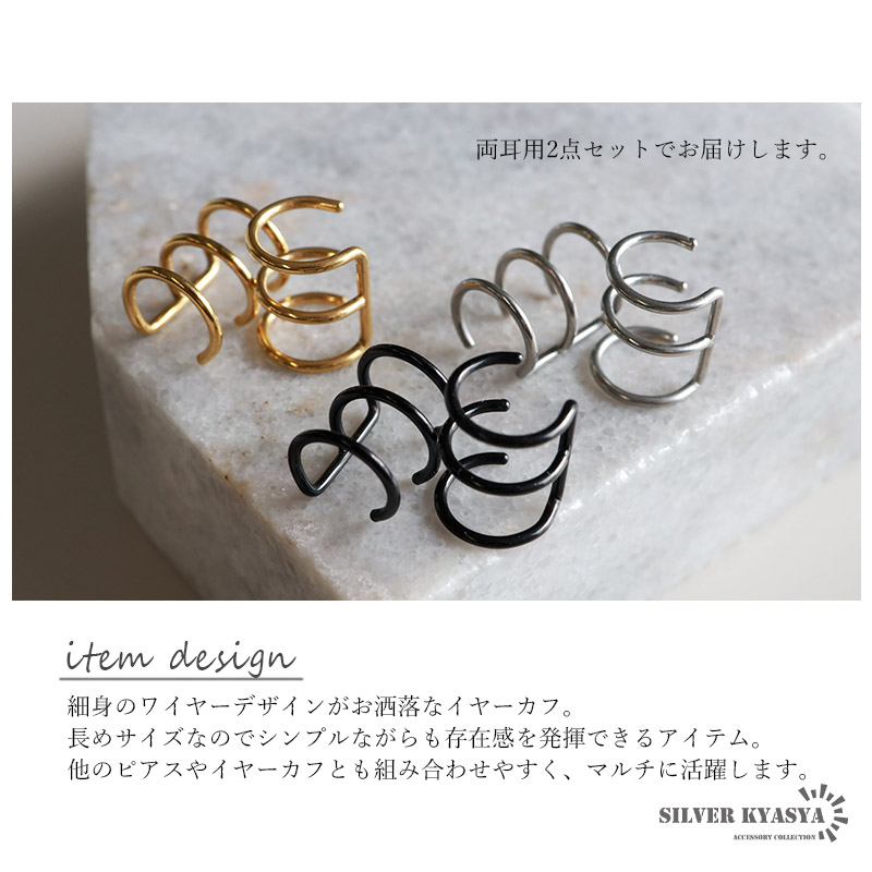両耳用2点セット シンプルイヤーカフ 3連 ワイヤー ロング ステンレス イヤーカフ ゴールド シルバー ブラック 挟むだけ 軽い gold 金属アレルギー対応