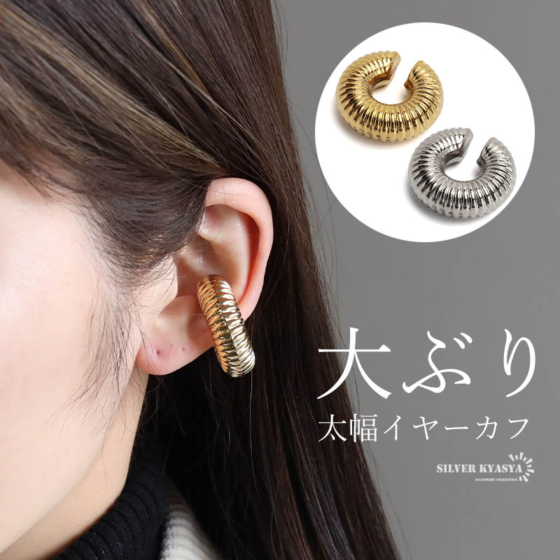 ラージイヤーカフ ステンレス 18KGP ゴールド シルバー 太幅 特大 ワイドイヤカフ ピアス 波模様 ラウンドイヤーカフ レディース 女性 金属アレルギー対応 片耳