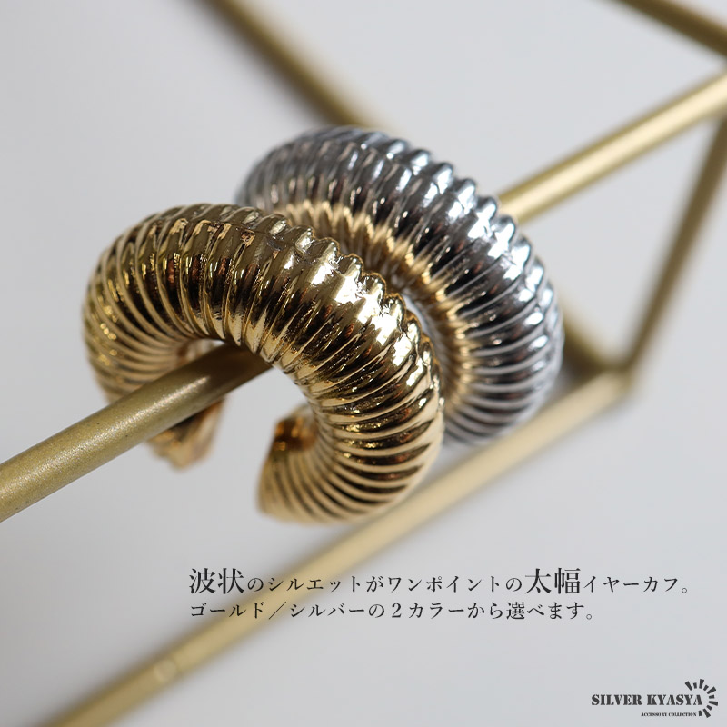 波状のシルエットがワンポイントの太幅イヤーカフ。ゴールド/シルバーの2カラーから選べます。
