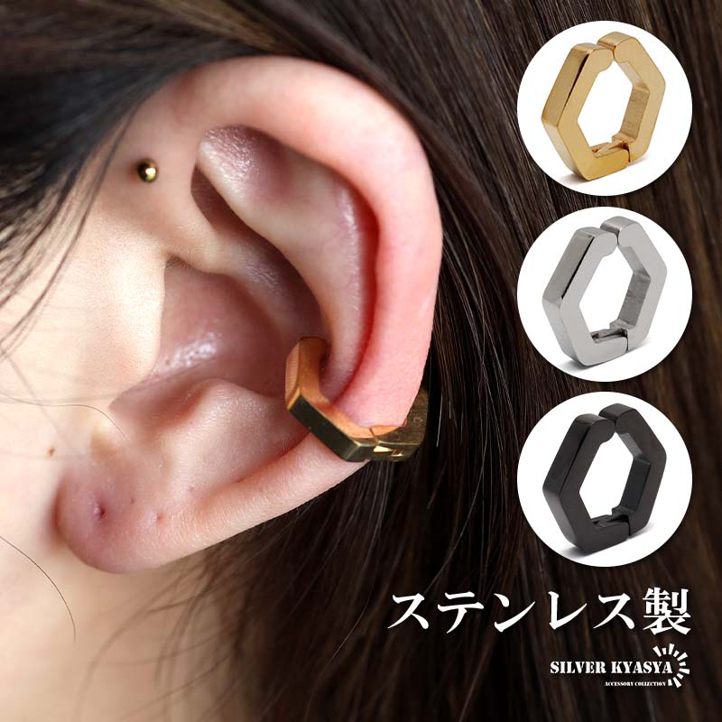 六角形イヤーカフ 6角ピアス 耳の穴不要 フープピアス イヤカフ ステンレス ゴールド シルバー ブラック 片耳 金属アレルギー対応