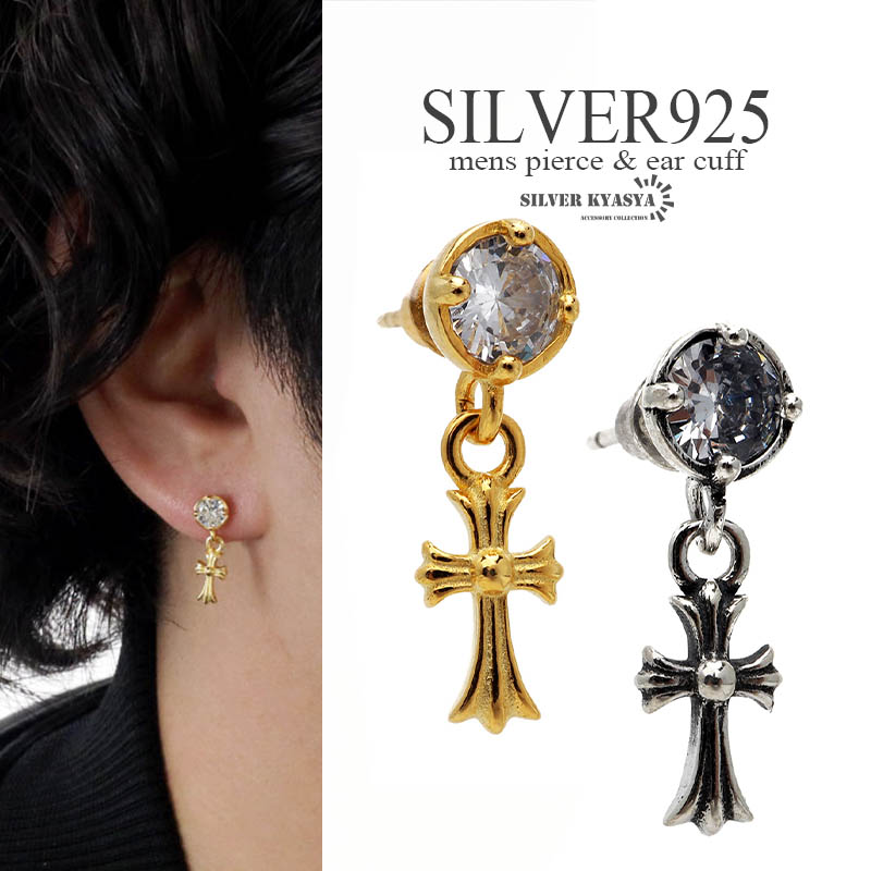 シルバー925 クロスピアス 十字架 ゴシック メンズ ピアス ドロップピアス ゴールド 18K GP 燻し 韓流 ストリート系 S925 金属アレルギー対応 片耳用 1点