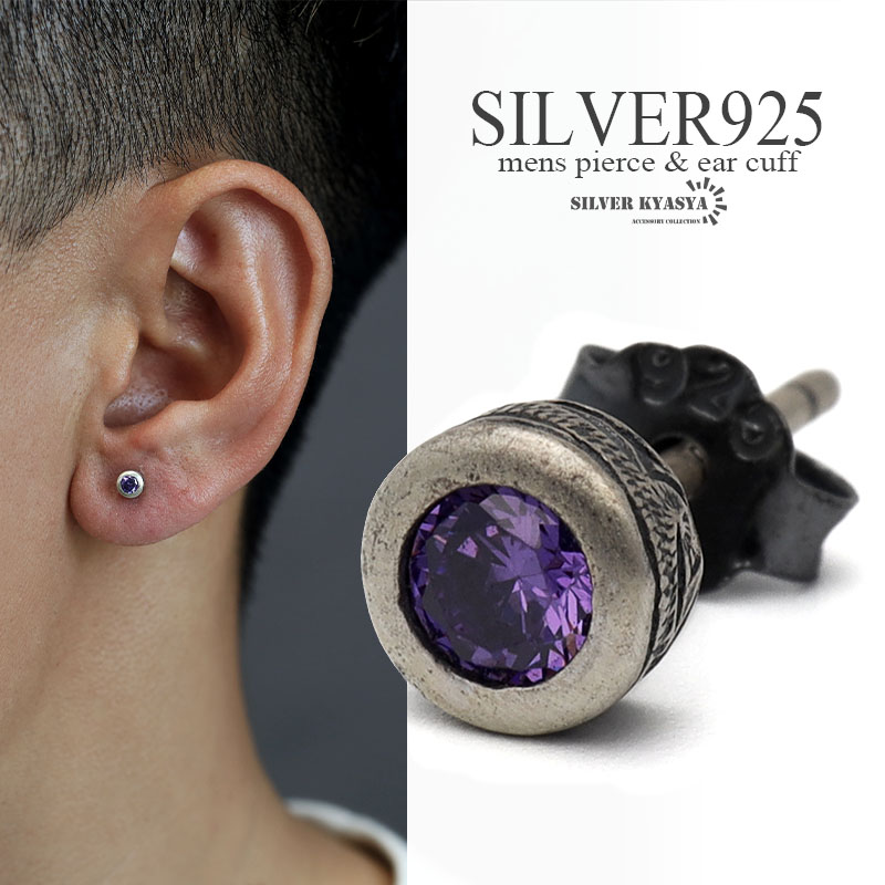 アメジストピアス シルバー925 メンズ スタッドピアス シルバー 一粒ピアス 燻 アンティーク 金属アレルギー対応 片耳 1点