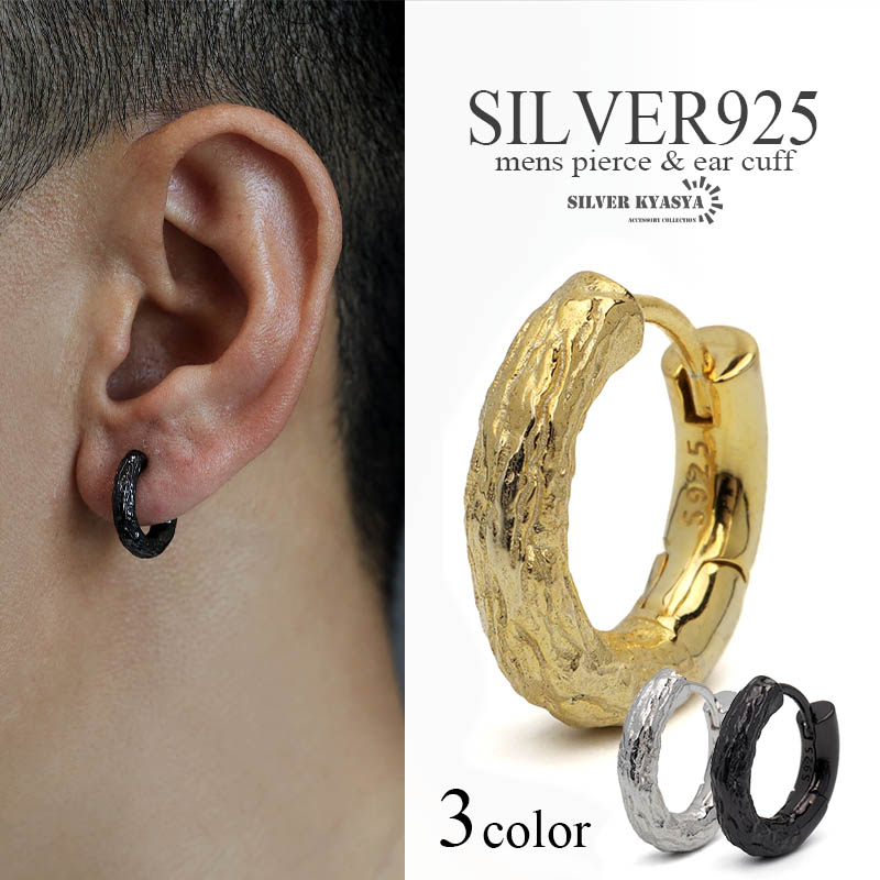 ワイドフープピアス シルバー925 18K GP 18金 メンズ つや消し ピアス ゴールド シルバー ブラック クラフト調 木目 シンプル 金属アレルギー対応 片耳 1点