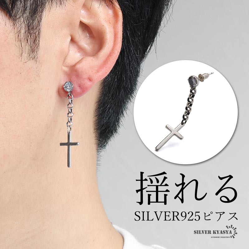 シルバー925 クロスピアス キラキラ ジルコニア 一粒ピアス 揺れる 十字架 シルバーピアス 金属アレルギー 対応 片耳用