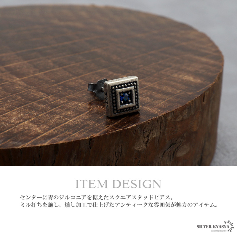センターに青のジルコニアを据えたスクエアスタッドピアス。ミル打ちを施し、燻し加工で仕上げたアンティークな雰囲気が魅力のアイテム。