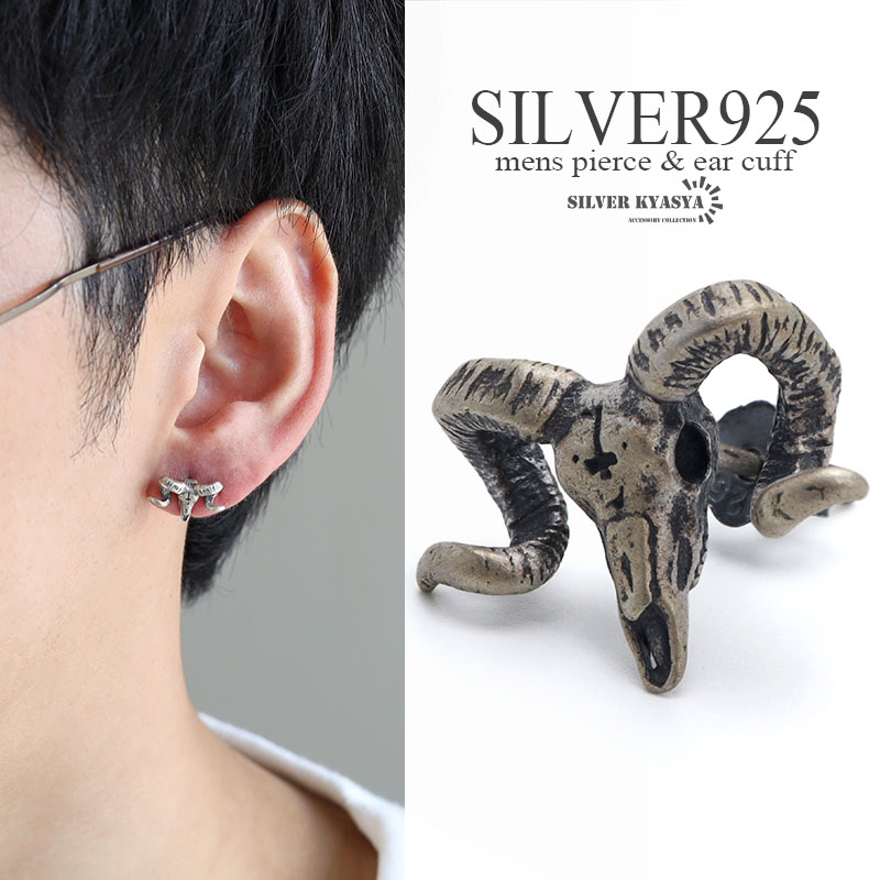 シルバー925素材 スカルホーンピアス シルバー スタッドピアス S925 羊 個性的 ネイティブ 金属アレルギーフリー 片耳