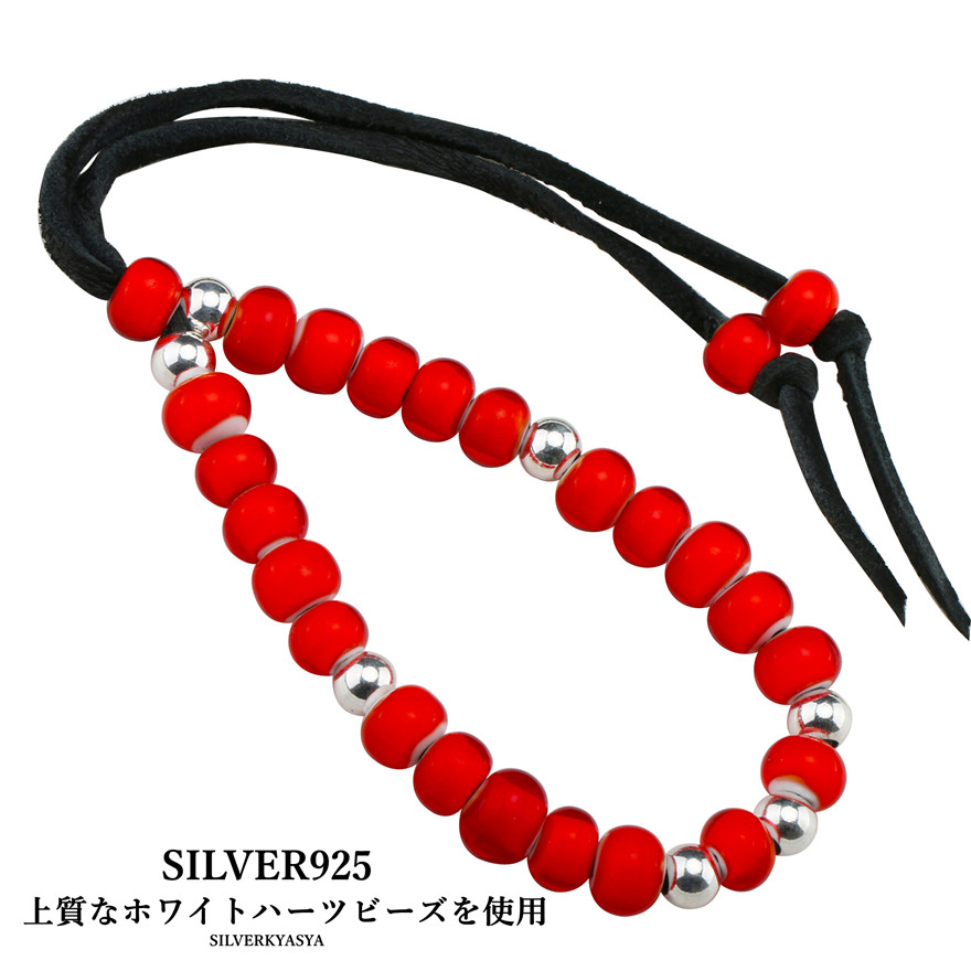 シルバー925 ホワイトハーツ ビーズ ブレスレット メンズ レディース ブレスレット 赤 ハンドメイド 本革
