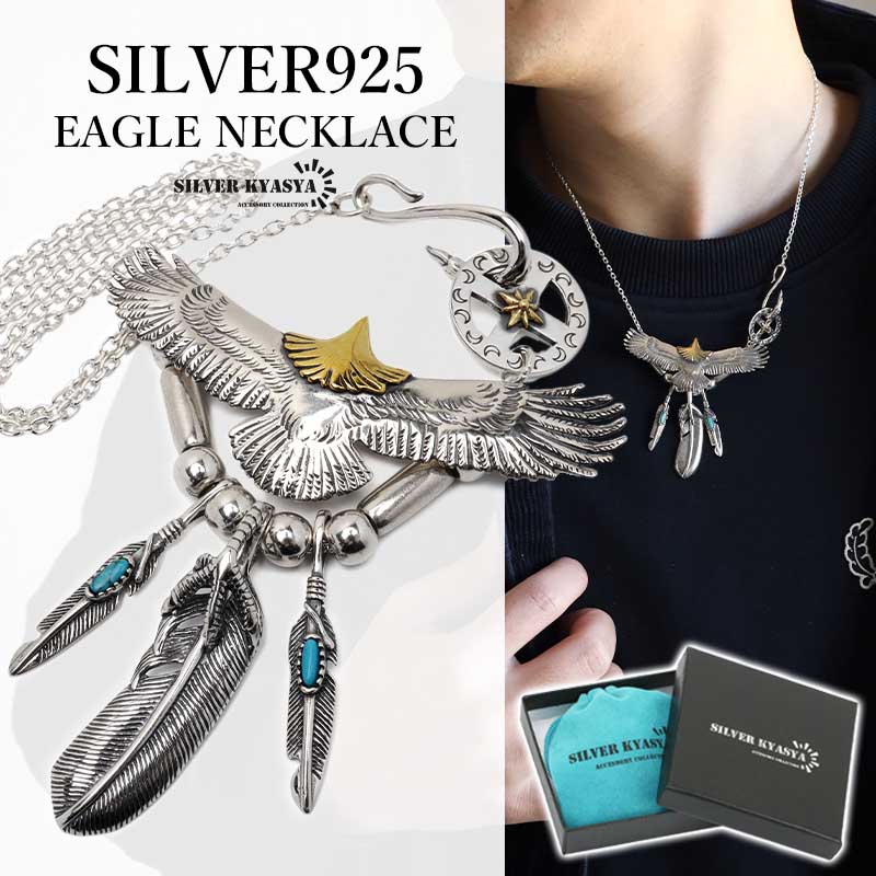 シルバー925 フェザーネックレス イーグルネックレス 羽根 ターコイズ カスタム ネイティブ 金属アレルギー対応 専用BOX付属