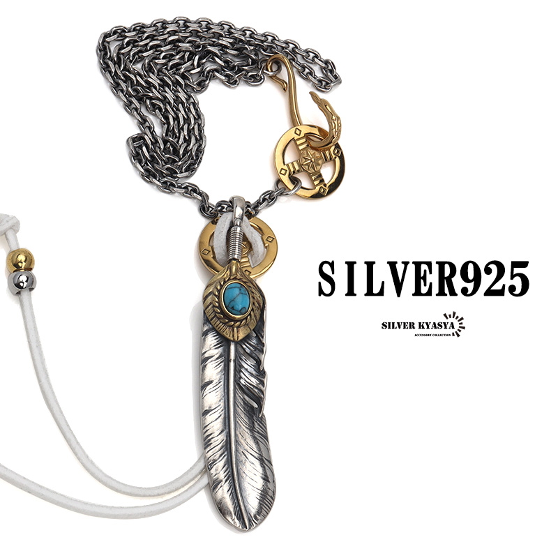 シルバー925素材 フェザーネックレス ターコイズ 羽根 シルバーネックレス イーグルフック 燻 完成度高い 専用BOX付属