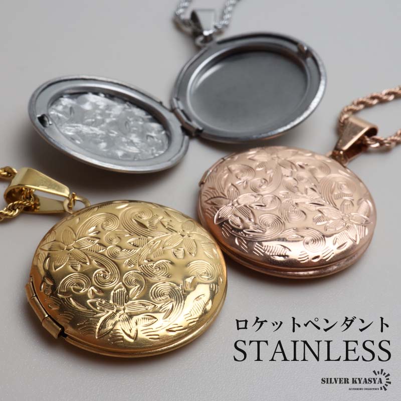 ステンレス ロケットネックレス ロケットペンダント フラワーネックレス 写真 記念 思い出 50cm 60cm ゴールドネックレス 18KGP シルバー ピンク 金アレ対応
